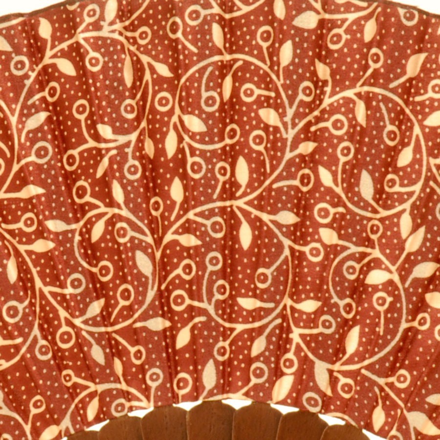 Cet éventail en soie orné de jfins feuillages sur un fond bordeaux et sa monture en bois exotique vous permettra d'affronter la chaleur avec style.